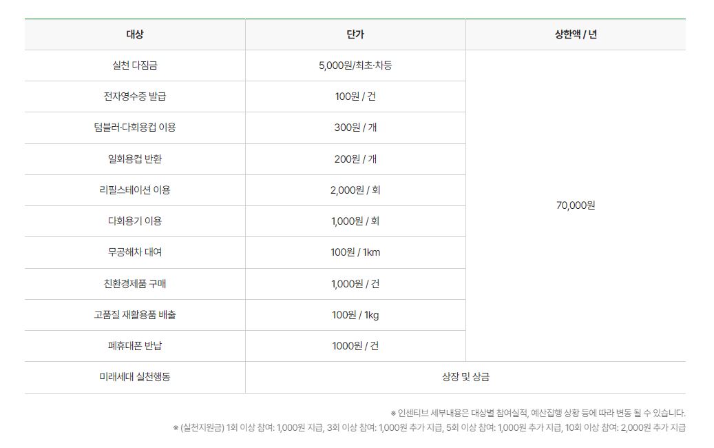 실천을 하고 차곡차곡 포인트를 쌓았다면 이제 입금이 되기를 기다리기만 하면 되는데요. 매월 말에 내가 모은 포인트가 입금이 된다고 합니다. 개인별 상한액은 70,000원으로 꽤 높은 금액이니, 열심히 한번 모아보는 것을 추천드릴게요.