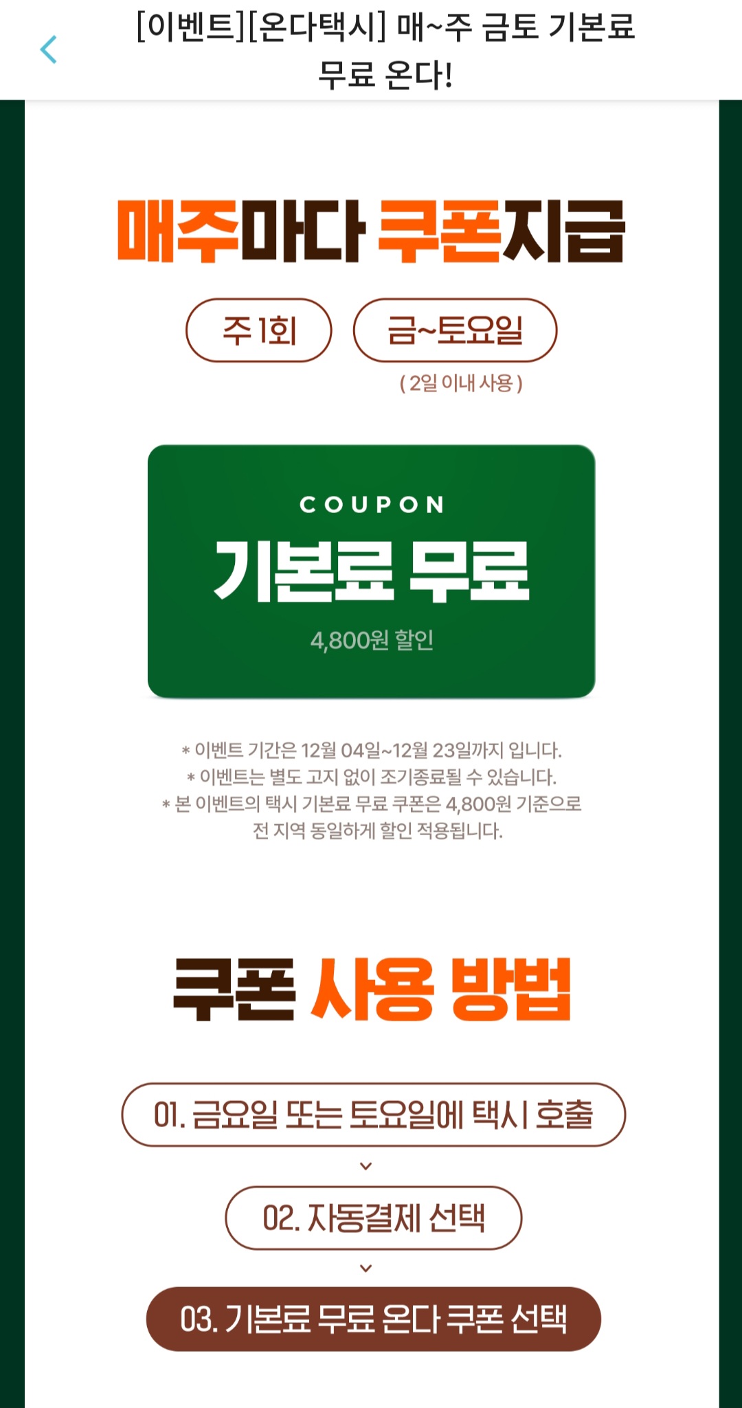 그런 티머니GO에서 이번에 파격적인 혜택을 제공하는 이벤트를 진행합니다. 2023년 12월 23일까지 매주 1회 기본요금을 0원으로 택시를 호출할 수 있습니다.