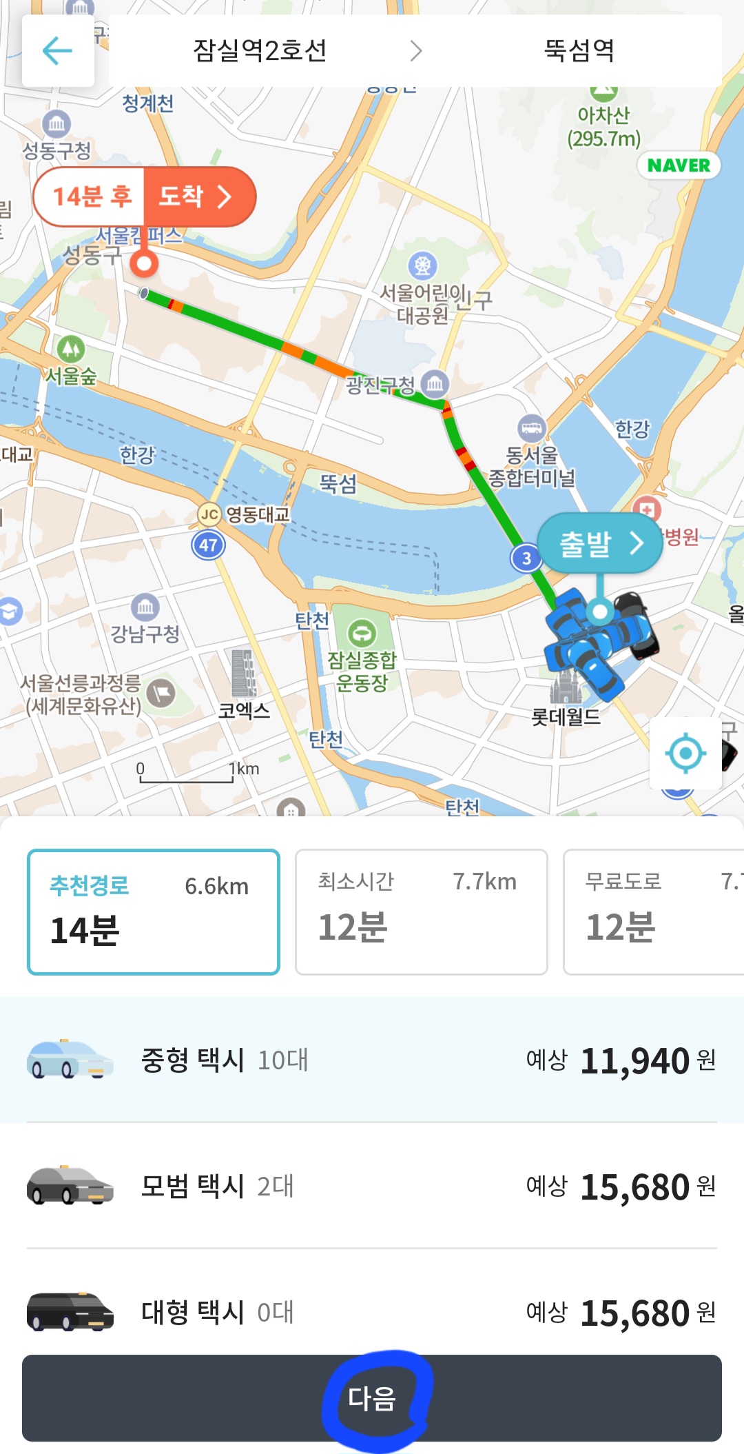 4. 도착지를 입력한 뒤에 원하는 이동 수단을 선택하고, [다음] 버튼을 클릭합니다. 그리고 [적용 가능한 쿠폰] 항목에서 ‘기본요금 무료’ 쿠폰을 선택합니다. 그러면 전체 금액에서 자동으로 할인이 들어갑니다.(쿠폰이 없을 시, 글 하단에서 '유의할 점'을 확인하세요.)